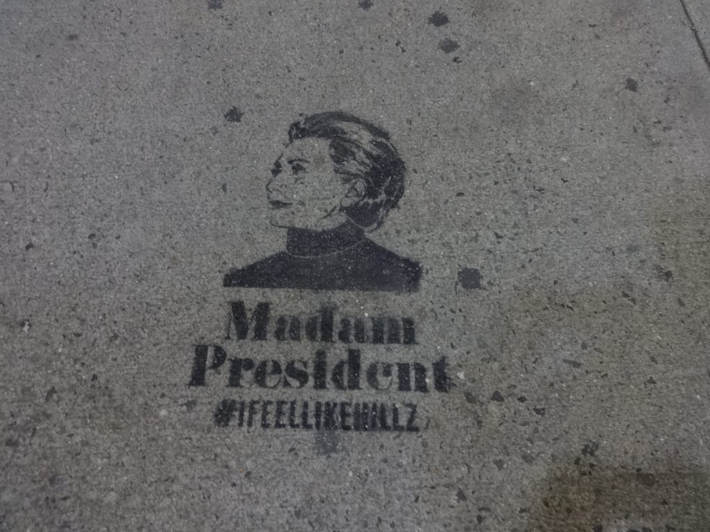 As I walked down 34th St. from the subway exit on Tuesday evening, I could see stenciled into the sidewalk Hillary Clinton’s head and the words “Madame President #IFEELLIKEHILLZ. I saw a good half dozen of these before I got to the Javits Center. There was a barricade at 10thAve. 34th. Police said they were only letting in those with some sort of special ticket. The staff member answering questions said that entrance was only for staff, VIPs and press. I wasn’t any of those. However, since I wasn’t press, I had decorated my press vest with a dozen different Hillary pins that I had picked up at or since the Convention. On my head was a cap that said Hillary for President 2008. I looked like I belonged inside the Javits Center with the rest of the celebrants.