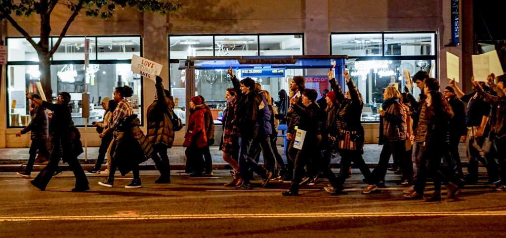 What about a democratic politics of bridging? What does that look like in practice? First, it means finding those few planks in Trump’s platform that might actually benefit a significant segment of American citizens. Renegotiating trade deals to yield greater benefits to American workers; securing affordable child care; reducing the influence of special interest lobbyists in Washington: these are areas where it might be possible to find common ground. Second, some progressives have joked that instead of moving to Canada they should move to red states. It’s hard to take that seriously, but the wisdom in it is that we must break out of our resonance machines and find ways of engaging with citizens who voted for Trump. Of course that doesn’t mean indulging the ideology of white supremacy that lies at the heart of the Trump phenomenon. But many – I dare say most – who voted for Trump would not avow that ideology. The first bridge we can build is to invite them to stand with us in condemning the hate crimes against African Americans, Latinos, gays, trans people, and women that have already been committed in Trump’s name.