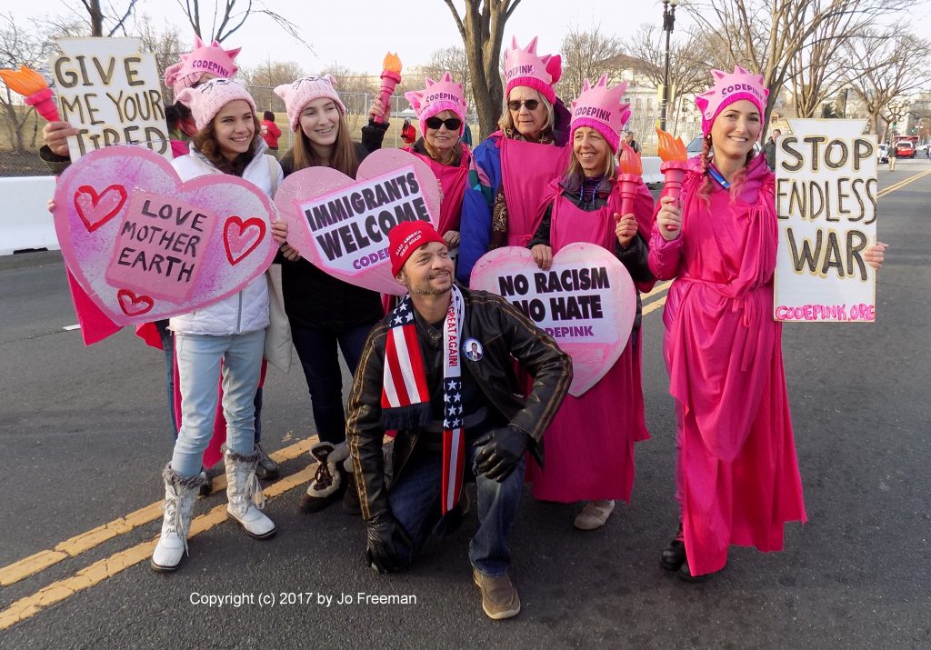 Protests at the 45th inaugural began the day before when CodePink, the women-led anti-war group congregated at the line to the inaugural concert to display their signs. Holding a banner that said “Kiss Me, I’m Peaceful,” about a dozen pink Ladies of Liberty promoted several issues. Currently these have more to do with immigration than war. Signs said “no human is illegal” and “refugees welcome.”