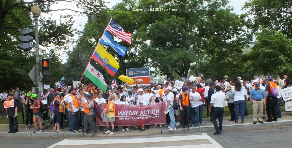 After gathering in Dupont Circle, roughly a thousand people marched down Connecticut Ave. to the Square, flanked by marshals in orange vests. There were so many that taking photos of the marchers was like shooting between raindrops. Printed signs, many provided by the AFL and the SEIU, were in Spanish on one side and English on the other. The most visible prop was multiple American flags.