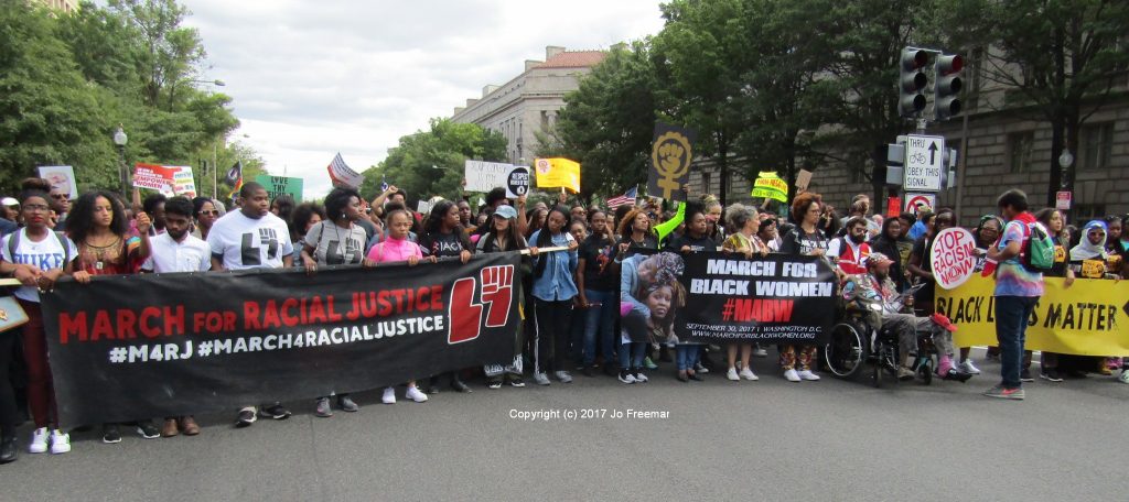 Shouted several thousand people as they marched up Pennsylvania Ave. from the Capitol on September 30. They were leading two marches, which started at two different points on Capital Hill before joining to march to the Department of Justice on 10th St. There they planned to turn south to go to the Mall. One was the March for Racial Justice, which took place in several different cities around the country. The other was the March for Black Women, which was specific to DC.