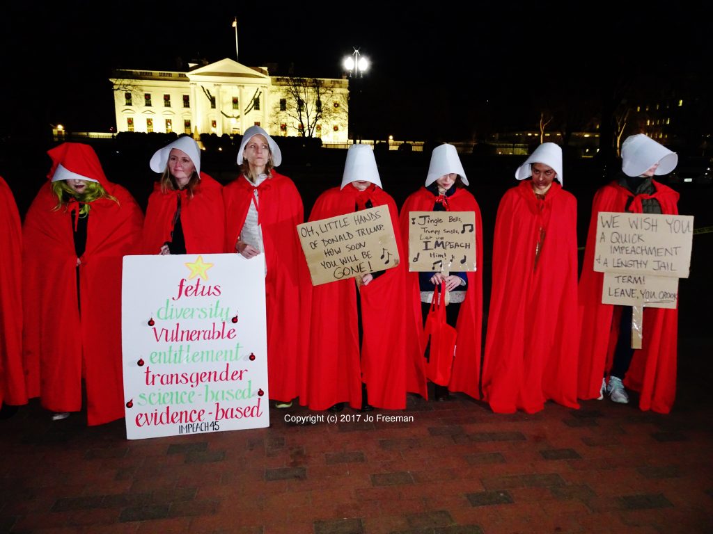 A dozen were dressed in the red cloaks of the handmaidens from The Handmaid’s Tale. Their signs evoked recent events, such as the seven forbidden words.