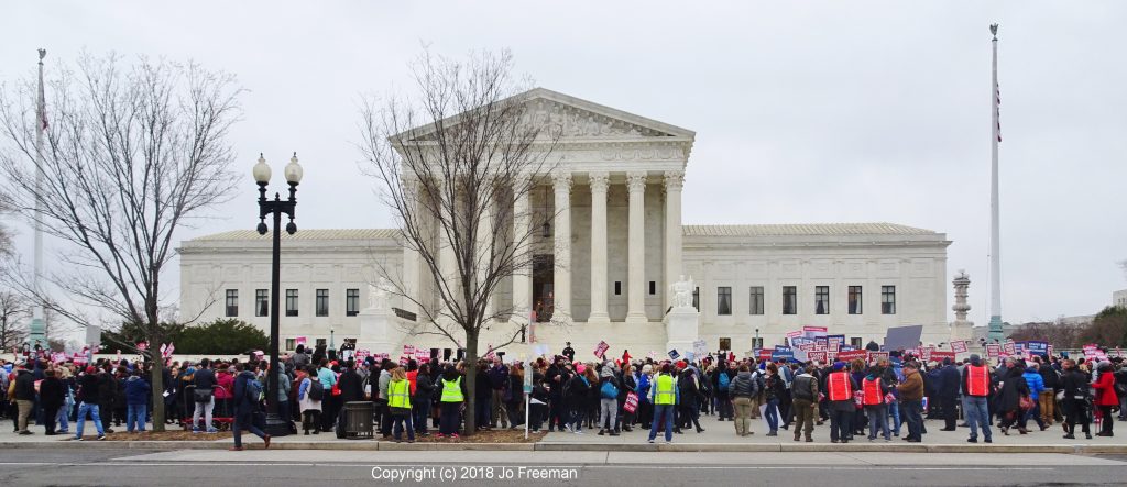 A thousand people rallied outside the Supreme Court the morning of January 26 while the Justices heard oral argument on Janus v. AFSCME Council 31 inside. The decision in this case will have profound effects on public service unions. Currently 22 states require employees who do not choose to join a union representing their workforce to still pay agency fees to that union. These are supposed to cover the costs of representation since unions must represent all workers in a bargaining unit and not just their members. Agency fees are less than full union dues, but they aren’t negligible.