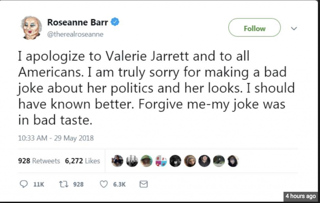 Did she really intend her attack on Jarrett to be a joke? Or was this the real Roseanne, her rage fueled (or not) by Ambien? I’m not sure we will ever know. As of this afternoon, buoyed by the number of supporters tweeting encouragement, Barr is walking back her contrition. If you were trying to decide whether to forgive her or not, you should probably wait.