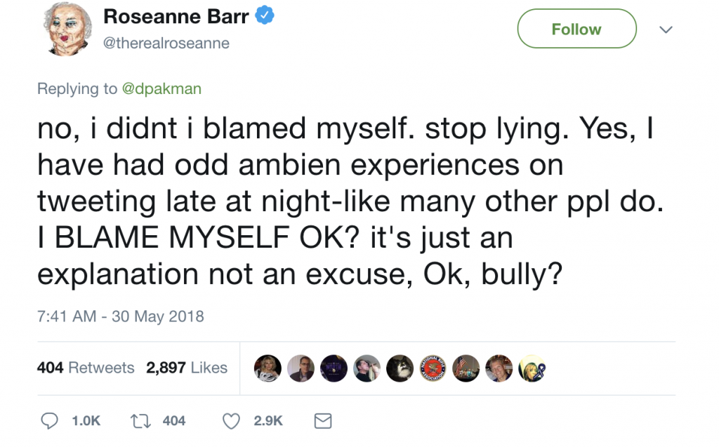 As of today, Roseanne has removed the offending tweet, apologized, and issued a series of increasingly angry and irritable explanations. In one of them, she claims to have been up all night under the influence of the sleeping pill Ambien: