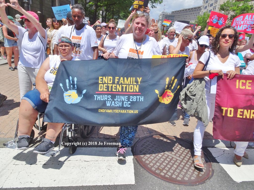When their leaders tinkled a bell, the women sat down and unwrapped foil “space blankets” that they had been given at Freedom Plaza. These were used to wrap children in by the border patrol so were used in the demonstration to symbolize separation of families.