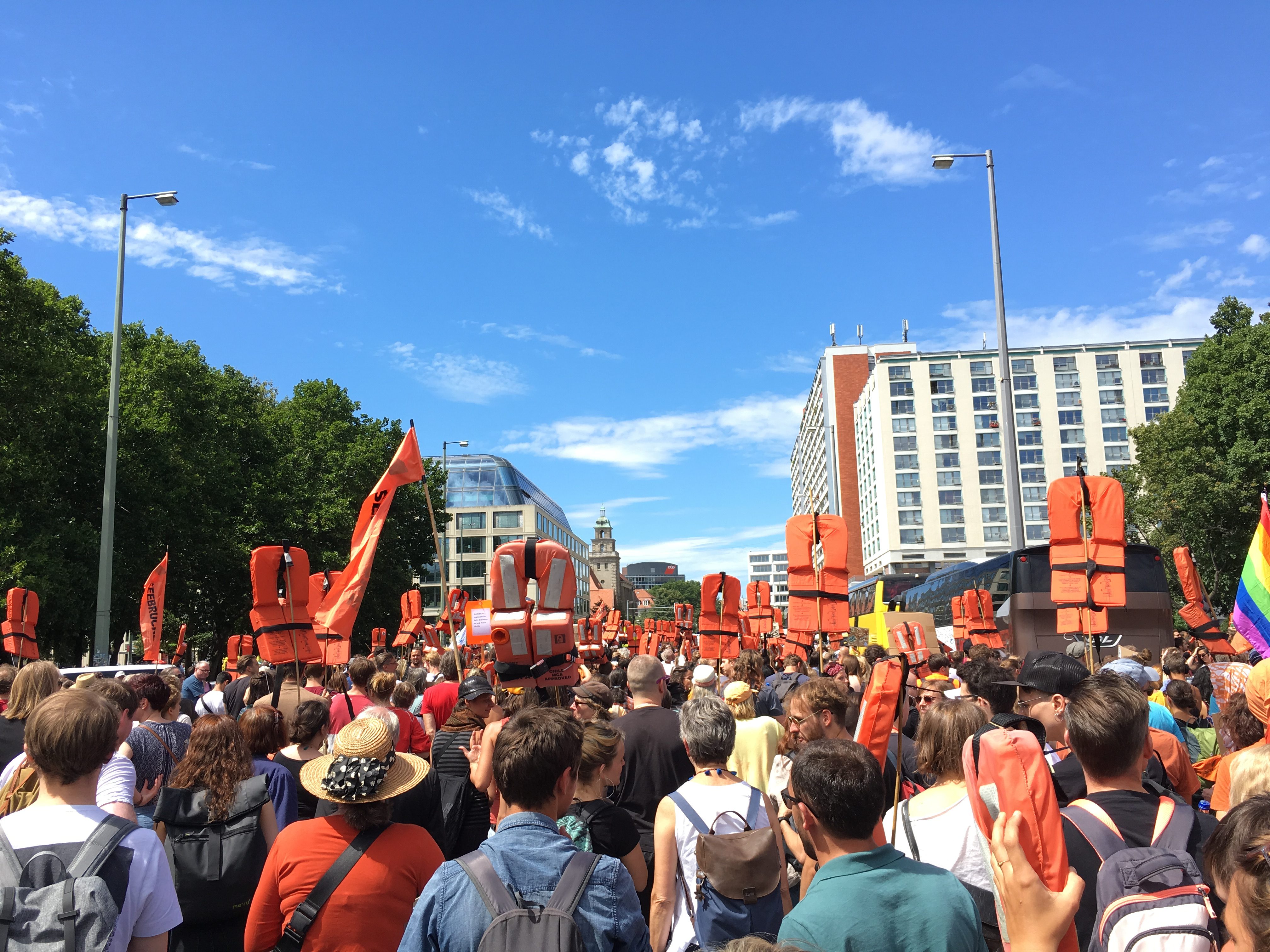 Something so horrific and close to home did not go unnoticed by Berliners (as well as by people living in Frankfurt, Bonn etc). As a city with such an international population, it was only natural that many people would protest. The streets of Berlin were filled with its people’s anger — anger directed at the inhumane decisions made by the EU and Italian government that were literally costing hundreds of people’s lives. We walked with signs rejecting the illegality and criminality of people searching for safer shores. We affirmed that refugees, like all other people, have an inherent humanity and should be accepted into Germany because of it. Rather than making some sort of utilitarian argument about accepting refugees because of what they might bring to the economy, we argued that we should unconditionally accept their claims for asylum — be they “model migrants” or not — because it is the humane thing to do in a humanitarian crisis. We held up orange life-jackets to illustrate the unspeakably difficult journey undertaken by so many refugees, and to remember those who have died in the Mediterranean Sea — some even without life jackets, or with fake ones that weighed their bodies down to the ocean floor.