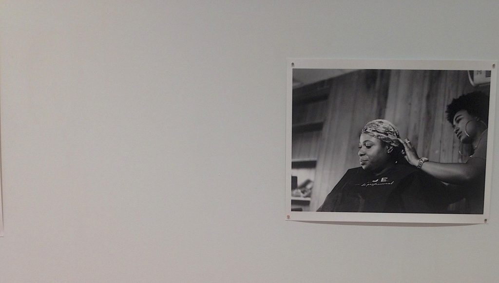 Imagine walking into the exhibit. A Color Removed is a process, and the process begins with the socially fraught meaning of color. Thus, as you enter the exhibition, you encounter the works of four African-American art makers (one a collective) from Cleveland. Back in April, they claimed that the project didn’t involve Black people. A Color Removed immediately moved to include them. Now some of the most powerful images of the exhibit are the portraits by Amanda King of Black women in Cleveland, including Tamir Rice’s mother, Samaria Rice, in a local beauty salon. M. Carmen Lane’s indigenous and Black sculpture of intergenerational trauma is soul-calling. What would Tamir Rice have felt?