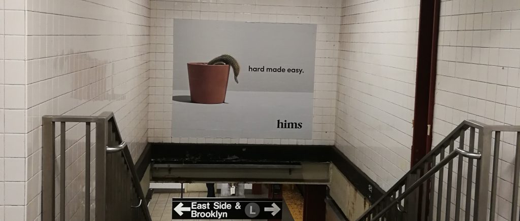 In the past few weeks a new advertisement campaign has invaded the New York City subway. A brand that claims to solve “men’s issues” called hims covers the walls and advertising panels of subway stations and trains. Hims is a brand that sells products to address “men’s issues” such as hair loss, skin imperfections and erectile dysfunction. Selling products to tackle these problems is in no way a new thing. Viagra has been around since 1998 and hair and skin treatments are fairly popular, both prescription and non-prescription. What hims offers is convenience, something that has become increasingly popular with the exorbitant growth of Amazon and other online retailers that offer quick delivery and minimum hassle.