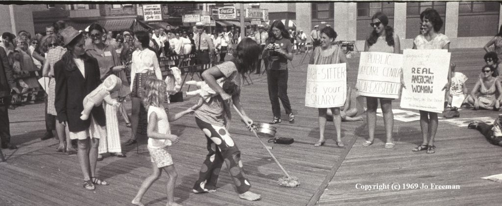In 1968 and 1969 women’s liberation staged demonstrations at the annual Miss America Beauty pageant held in Atlantic City, NJ. The 1968 protest shocked the country, creating a lot of publicity, and some myths, about the new movement. The 1969 protest was smaller and was largely ignored.