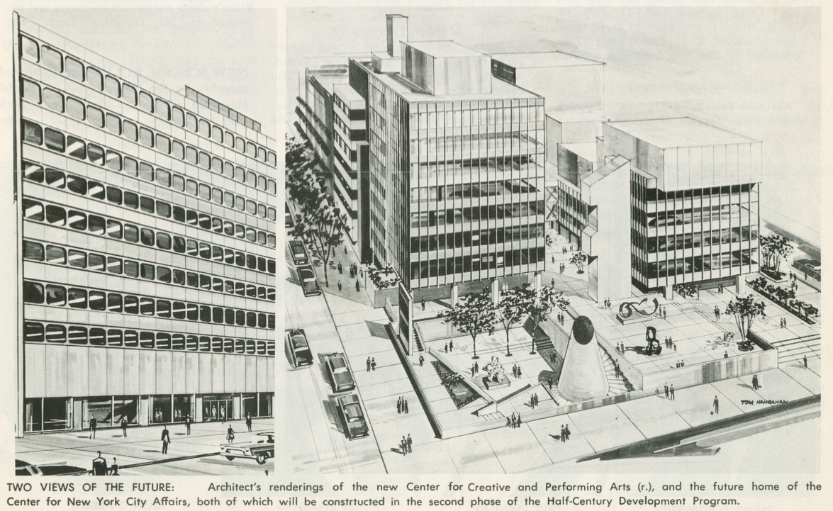One way to leaven our centennializing is to look at past anniversaries, tittering at their dated ways of understanding themselves as timely and as timeless, noting balls dropped and bullets dodged along with genuine moments of serendipity and what Hannah Arendt called natality. When the New School celebrated its half-century in 1969, one outside analysis gave a penetrating account of “The New School at Middle Age,” describing a three-part institution comprising “an interesting but essentially frivolous menagerie,” “an unimaginative mediocrity” and a “youthful but potentially valuable experiment.” The “menagerie” was the Adult Division, today nearly atrophied; the “mediocrity” was the Graduate Faculty, which would almost lose its accreditation in the next decade. The “experiment” was the New School College, a forgotten predecessor to Eugene Lang College of Liberal Arts which was begun with fanfare in 1966 and abandoned without comment five years later. For its part, the New School saw a bright future in urban studies and in the performing arts, as shown in the plans for an extended campus that President John R. Everett shared in the New School Bulletin in January 1969 (below). No one, inside or out, could have then imagined that the school’s fortunes would instead be shaped by a merger with a design school uptown.