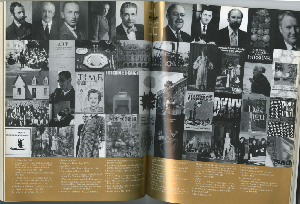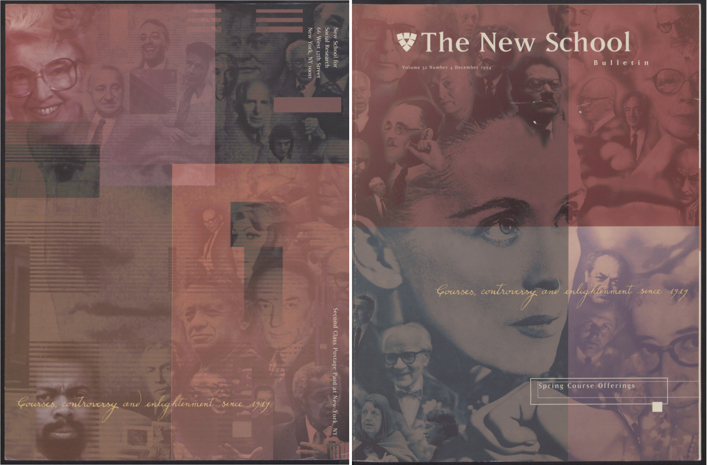 Few at Parsons, or at The New School, would tell the story this way today. This is not only because times change but also because the potentialities established by Parsons’ merger with The New School have only come to fruition in the last two decades. Striking in 1996 is the virtual absence — except as a deus ex machina — of The New School in the story of Parsons’ mission or future. It should be noted that the New School’s absence from Parsons’ self-understanding is paralleled by Parsons’ absence from the New School’s storytelling at its 75th anniversary two years before. The collage Sanjay Kothary produced for the cover of the Spring 1995 New School Bulletin includes fifty famous New Schoolers from every discipline and decade, but not one star from the Parsons firmament.