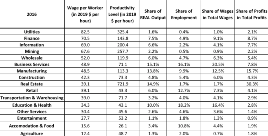 Real wages and productivity vary over wide ranges. The same is true of sectoral profits. Real estate takes the lion’s share, followed by manufacturing, finance, business services, and information. Profits are meager from retail on down the rows, while output and especially employment shares are relatively high. The three sectors mentioned above — retail, accommodation and food, and other services – provide around 46 million jobs, more than one-quarter of the 162 million total. Their labor payments amount to $263 billion, about one percent of GDP of $21 trillion. This number can be contrasted with $600 billion of profits in real estate. Incomes of low-wage workers do not matter greatly in the grand macroeconomic scheme of things, but for them even a ten percent income loss would be devastating.