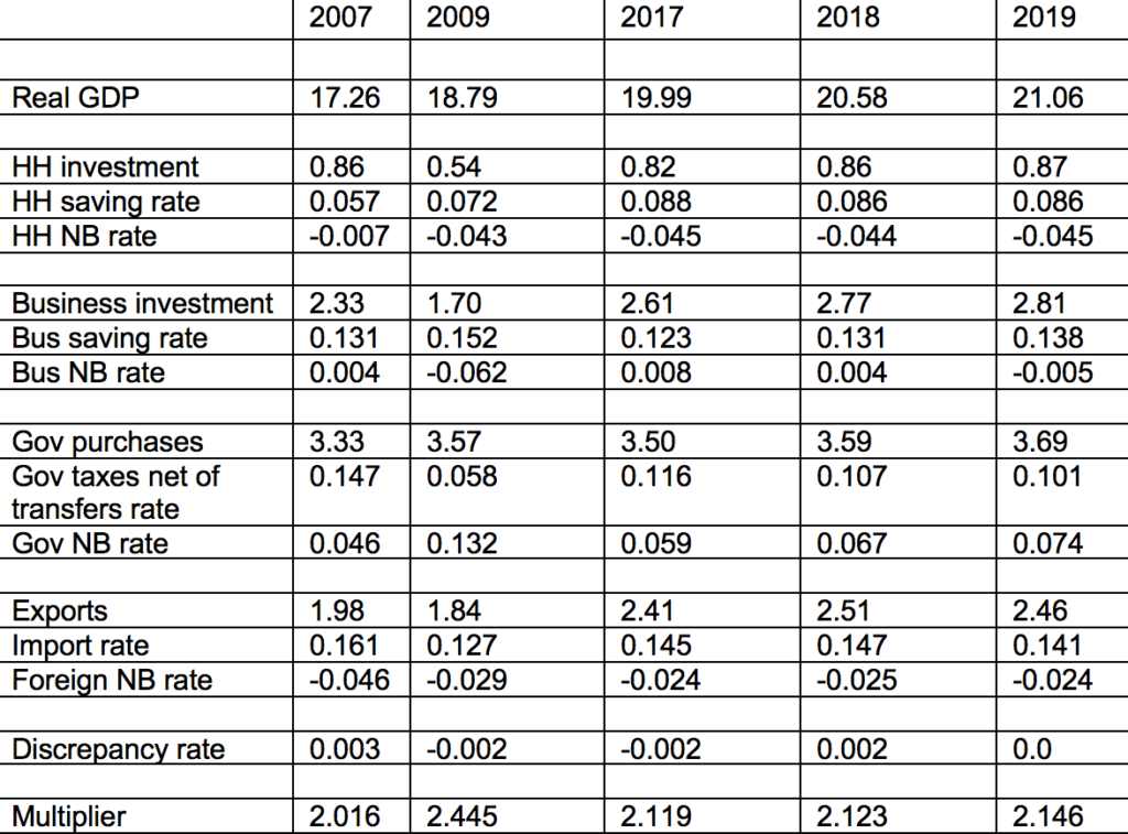 Each year’s “multiplier” is the inverse of the sum of the four leakage rates. The multiplier times the sum of injections equals output.