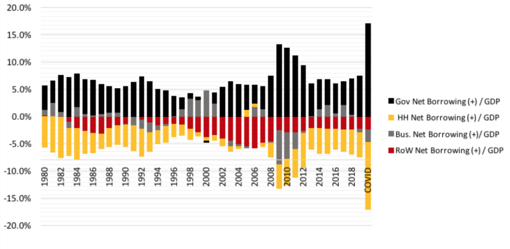 Both episodes show that changing government net borrowing plays a key role in macroeconomic adjustment. More government spending on goods and services (unimportant in 2007-09) will also have to help absorb the COVID-19 shock