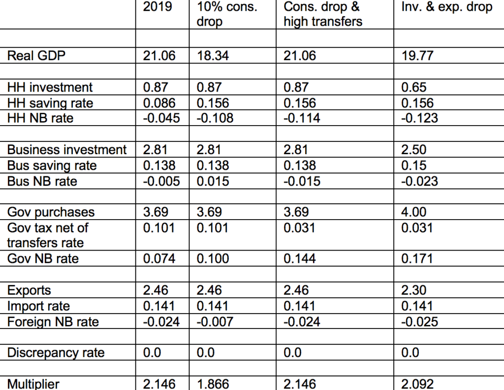 In a quirk of national accounting, HH net borrowing falls from -0.045 to -0.108, or net lending to the rest of the economy rises to close to 11% of GDP. Presumably, the higher “lending” would take the form of paying off debt. In practice, that will not happen. The proper policy response would be a decrease in the government’s tax-minus-transfer rate from 0.101 to 0.031, taking the form of a $1.5 trillion transfer to households, which could hold consumption spending and output stable over the year. Government borrowing would rise by 7% of GDP, or from $1.56 to $3.03 trillion (compare the two rightmost bars of Figure 1). This hypothetical percentage increase exceeds the actual change between 2007 and 2009 recorded in Table 2.