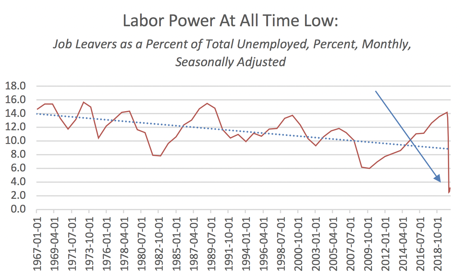 Power inequality: When the unemployment numbers come out every month on “Jobs Day,” I look closely at the “labor power index”: the percentage of people who are unemployed because they left their job to look for a better one. They are called “job leavers.” I call them the people who are able to say “take this job and shove it.” In February, 2020, the “take this job and shove it” was a rather normal 13.4%; since 1968, the share of the unemployed who left voluntarily has been steadily declining, ranging from a high of over 15% to a low in the 2008 recession of 6%. In June 2020, the share of job leavers was only 3% of the unemployed. This low “take this job and shove it” number means workers will have a difficult time bargaining effectively for higher pay or safer working conditions.