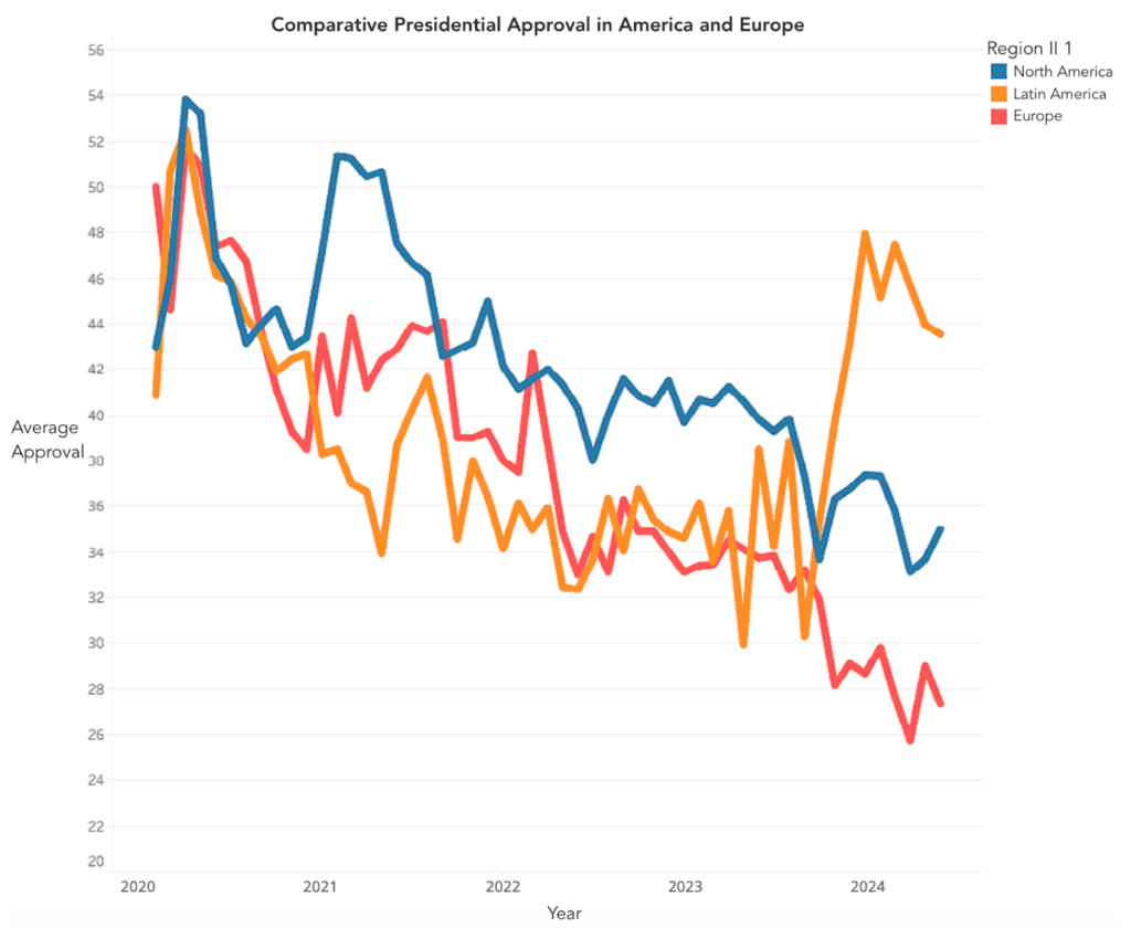 In early November 2024, PULSAR, the academic observatory of the University of Buenos Aires, and the Konrad Adenauer Foundation (KAS), published a Spanish-language report that analyzed the social approval of national governments in 16 countries across Western Europe, North America, and Latin America. The document compiled approval ratings of presidents and prime ministers from Argentina, Bolivia, Brazil, Canada, Chile, Colombia, Ecuador, England, France, Germany, Italy, Paraguay, Peru, Spain, United States, and Uruguay, based on 2,385 published approval records and reports conducted by 2,260 specialized consulting firms between 2020–the onset of the COVID pandemic–and 2024.