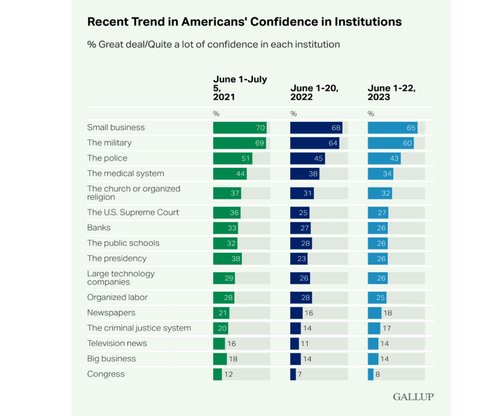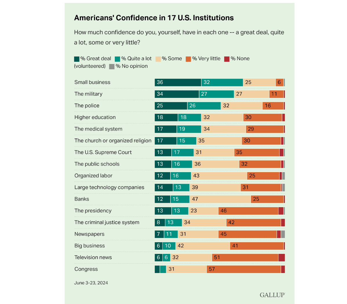 A national survey conducted by GALLUP in June 2024 reveals alarmingly low levels of trust among Americans regarding most of the institutions measured. As shown below in Figure 2, it is not only the executive branch but all political institutions, including Congress, the criminal justice system, and the US Supreme Court, that have lost the trust of Americans. Furthermore, the cross-temporal comparison depicted in Figure 3 highlights the steady decline in trust across nearly every significant institution.