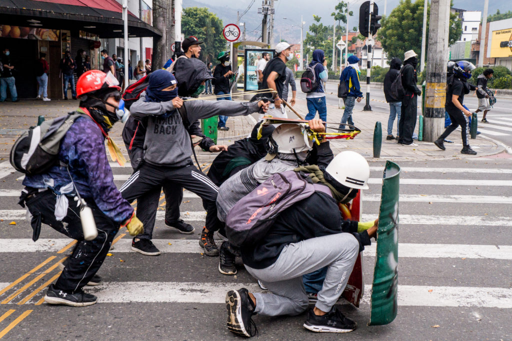 Frontline protestors in Medellín, Colombia, on May 28, 2021. Photo credit: Roger.Rondon / Shutterstock.com