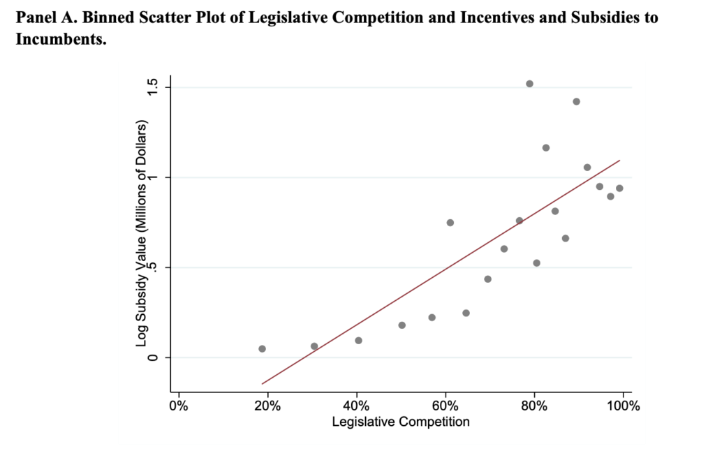 As a result, it makes sense that high levels of legislative competition — meaning tiny majorities for the party in power, and a higher likelihood that a legislative chamber can flip from one party to another — make handouts to incumbent, dominant firms more likely. In those instances, legislators on the margins need more political capital to win re-election and have more power to extract concessions during legislative debates because their votes are more valuable.