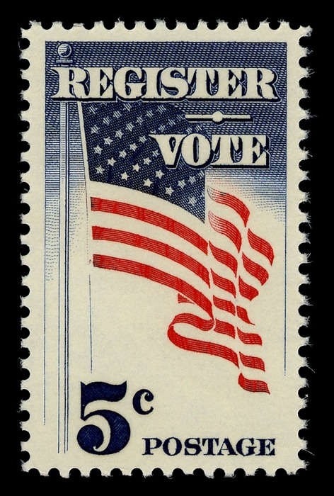 Consider two stamps from the 1960s that sent a message from the United States government to the public: Register and vote.