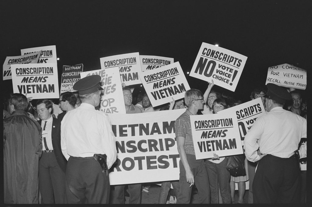 Anti-Vietnam War demonstration Martin Place and Garden Island Dockyard, Sydney, 1966. Image credit: Tribune negatives collection, State Library of New South Wales / Wikimedia Commons.