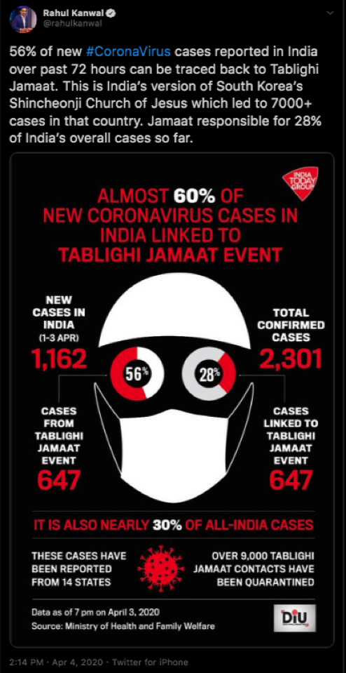 Rahul Kanwal, a senior journalist at India Today, on April 4 shared this infographic depicting statistics using the image of a man with a skull cap i.e. a Muslim man. Source: Rahul Kanwal, Twitter, 2020