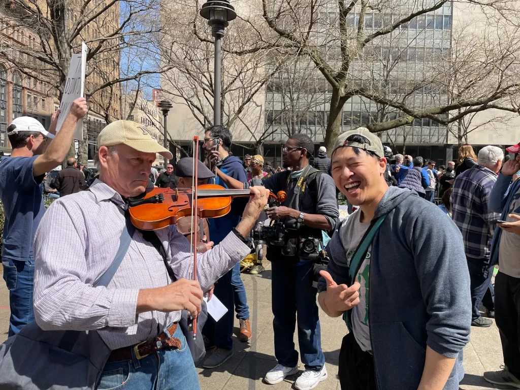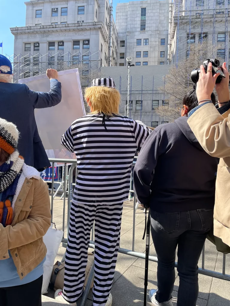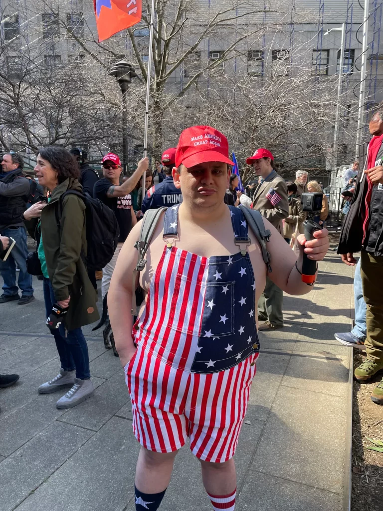 Long Island’s GOP Congressman George Santos, a serial fabulist, was spotted at the protest. Reports say that Marjorie Taylor Greene tried to speak but was shouted down by counter-protesters: she may have also been a little freaked out by the collection of alte kakers, performance artists, and crackpots who routinely show up at New York demos.