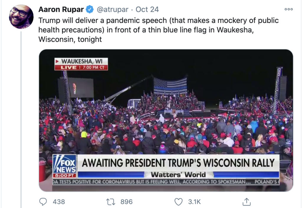Flags matter. They are the tangible symbol of a people united for a cause. That Trump replaced the American flag with the Thin Blue Line flag as the centerpiece of his rally is a rejection of the nation itself in favor of his role as the leader of the alt-right. And it was not inadvertent. White House press secretary Kayleigh McEnany called attention to the prominence of the flag, tweeting: “The Thin Blue Line flag is flying HIGH at President [Trump’s] rally in Wisconsin!”
